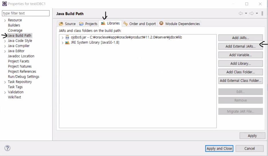 ojdbc6파일 선택하여 확인 -> Apply and Clolse