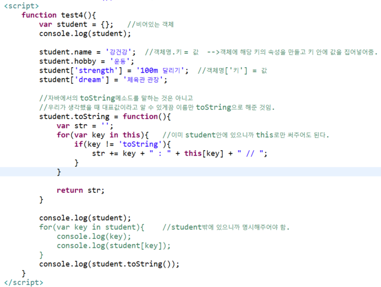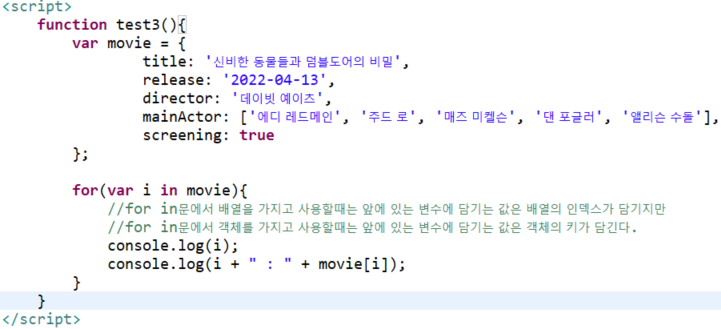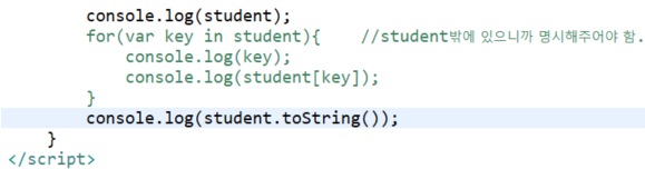 ** for in문에서 객체를 가지고 사용할때는 앞에 있는 변수에 담기는 값은 객체의 키가 담긴다.