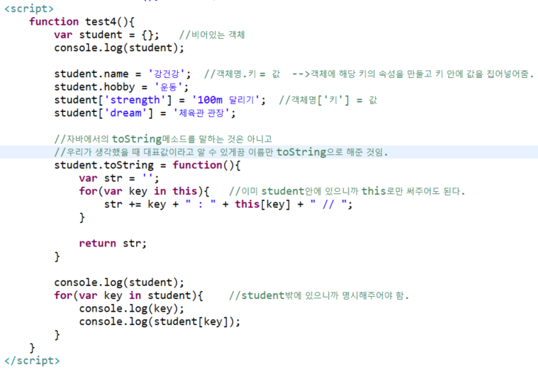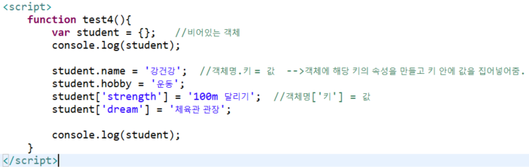 객체명.키 = 값 -->객체에 해당 키의 속성을 만들고 안에 값을 집어넣어줌.
