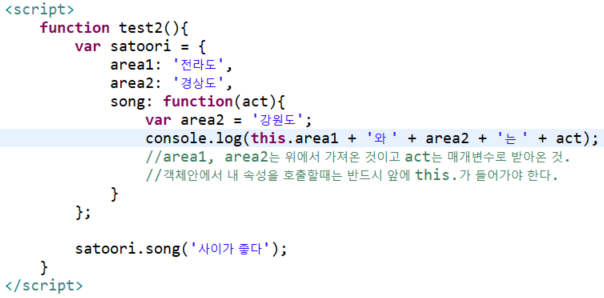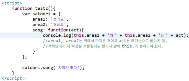 ** 객체안의 함수안에서 함수 밖의 객체안에 있는 속성을 호출할때는 반드시 앞에 this.를 붙여야 한다. **